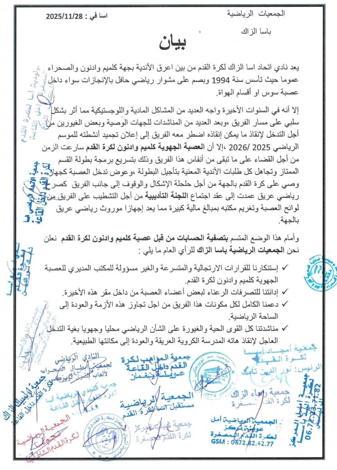 أمام هذا الوضع، أعلنت الجمعيات الرياضية بآسا الزاك في بلاغ توصلت ” الغد نيوز ” بنسخة منه ٫ عن موقفها الرسمي للرأي العام، مشددة على ثلاثة نقاط رئيسية: